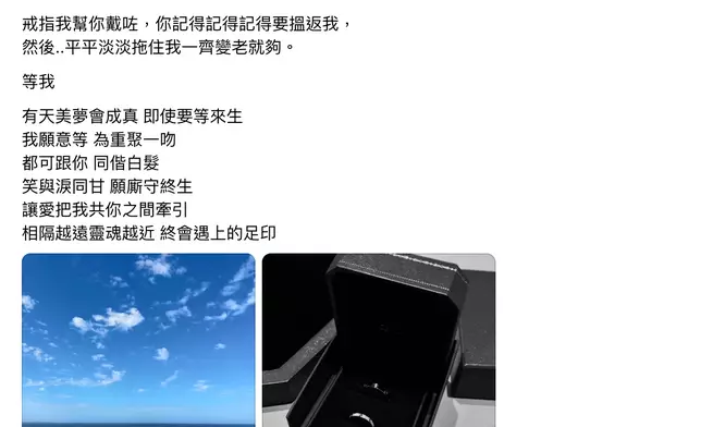 她又藉「遠在眼前」的歌詞,傾訴自己痛徹心扉的傷痛:「等我有天美夢會成真,即使要等來生,我願意等,為重聚一吻,都可跟你同偕白髮,笑與淚同甘,願廝守終生,讓愛把我共你之間牽引,相隔越遠靈魂越近,終會遇上的足印。」貼文中的兩人甜蜜相擁,看盡世間風景,而再也戴不上的婚戒,再也觸不到的戀人,見者心酸。