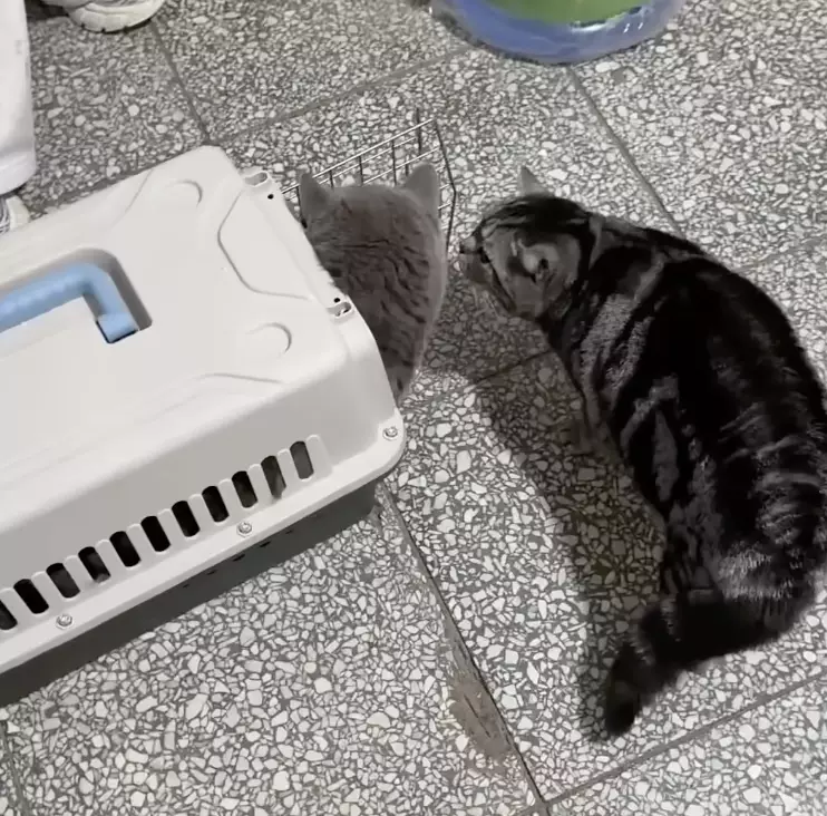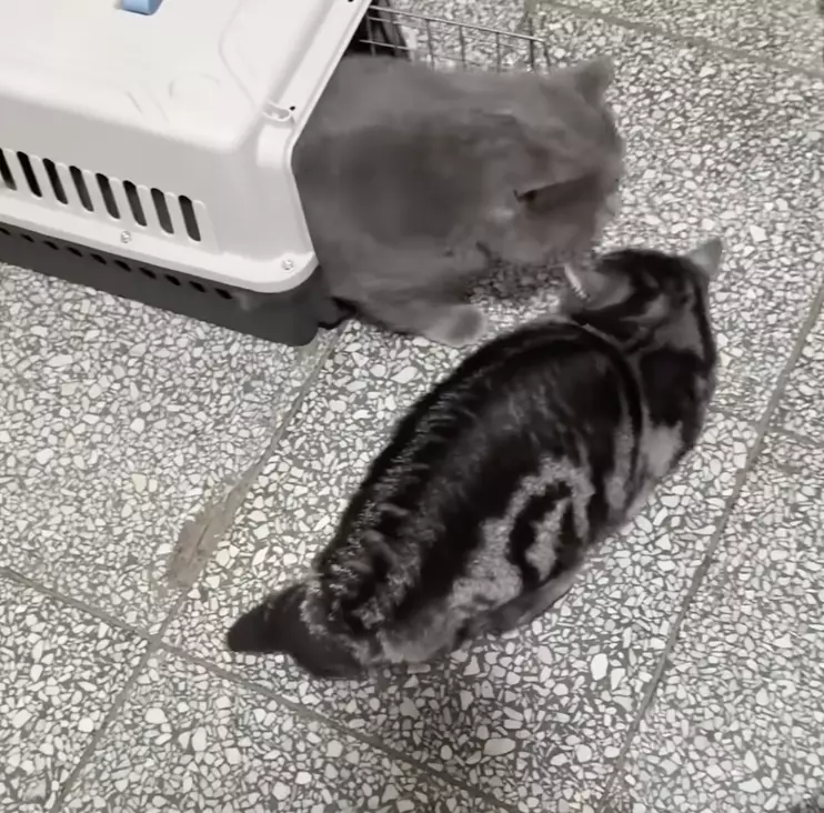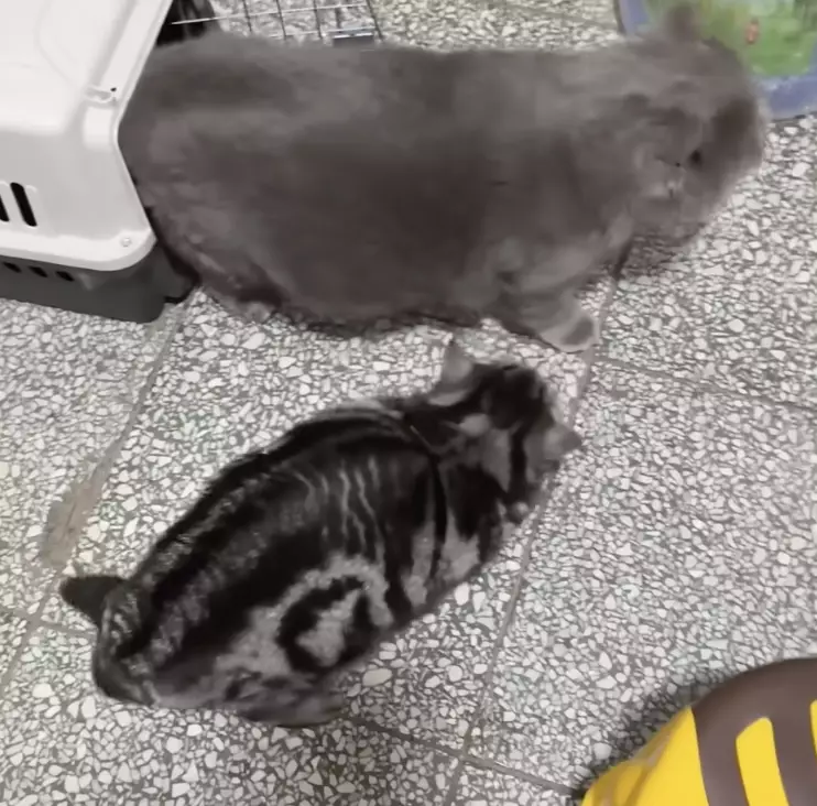 一隻胖到裂開的虎斑貓見到飼主帶回一隻裝在籠子裡的新室友,立刻擺出老大的架勢對著籠子叫囂。沒想到當新來的流浪貓從籠子裡走出時,噸位竟然比牠大上一倍,瞬間讓這位原住民嚇到變臉,態度也從囂張變成了卑微,彷彿在說「大哥請指教」。