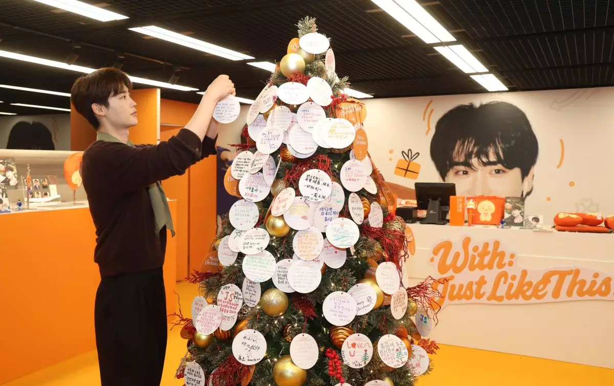 李鍾碩親手為聖誕樹掛上祝福語。主辦單位提供圖片