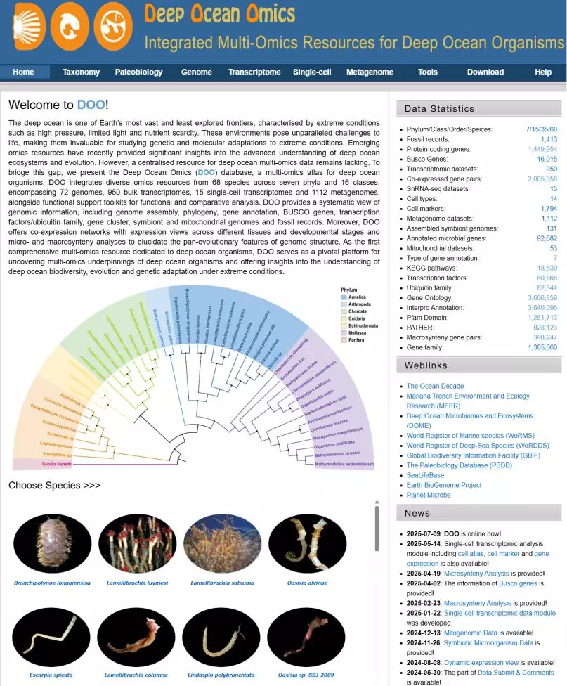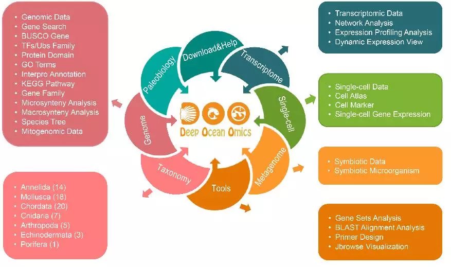 數據庫是目前物種覆蓋最廣、數據最全面的深海多組學平台,整合了 68 種深海動物的多組學數據,涵蓋七大門類物種,包括軟體動物、環節動物、節肢動物、脊索動物、刺胞動物、棘皮動物及多孔動物。
