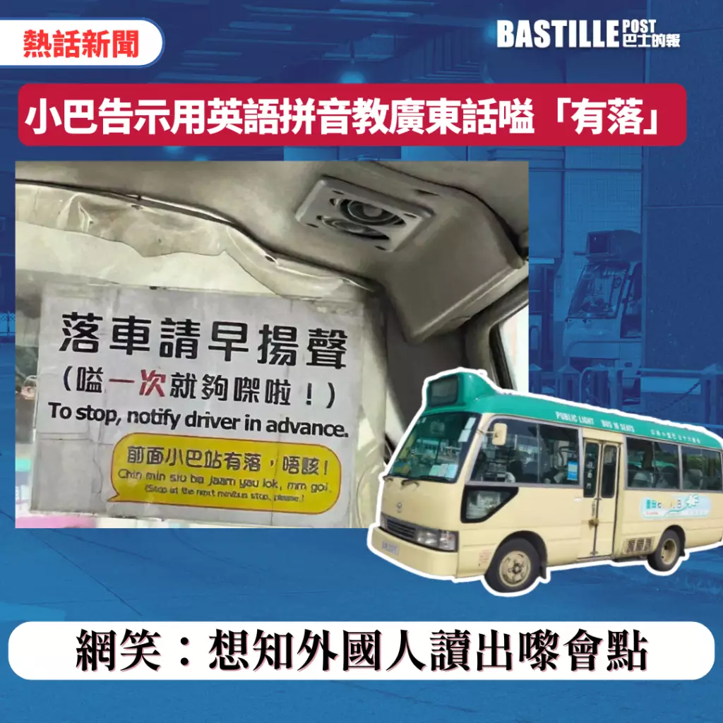 網民在社交平台分享了一張小巴告示,其告示除了印有中文「前面小巴站有落,唔該」,更貼心地以英語拼出這句說話的廣東話讀音:「Chin min siu ba jaam yau lok, mm goi.」笑言好「想知外國人讀出嚟會點」。