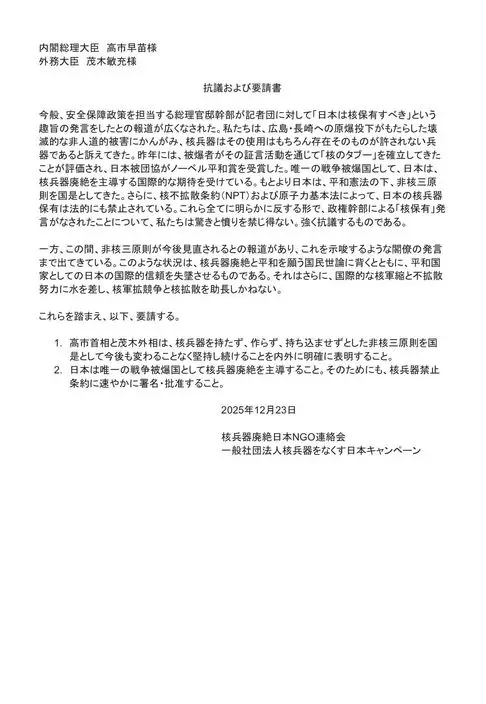 日本核爆受害者及民間團體組成的廢除核武器日本運動組織,向外務省提交致首相高市早苗及外相茂木敏充的請願書,要求明確表態堅持把無核三原則作為國家方針等。