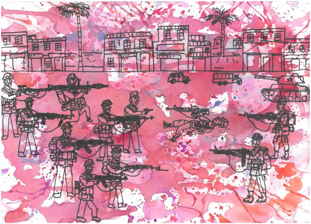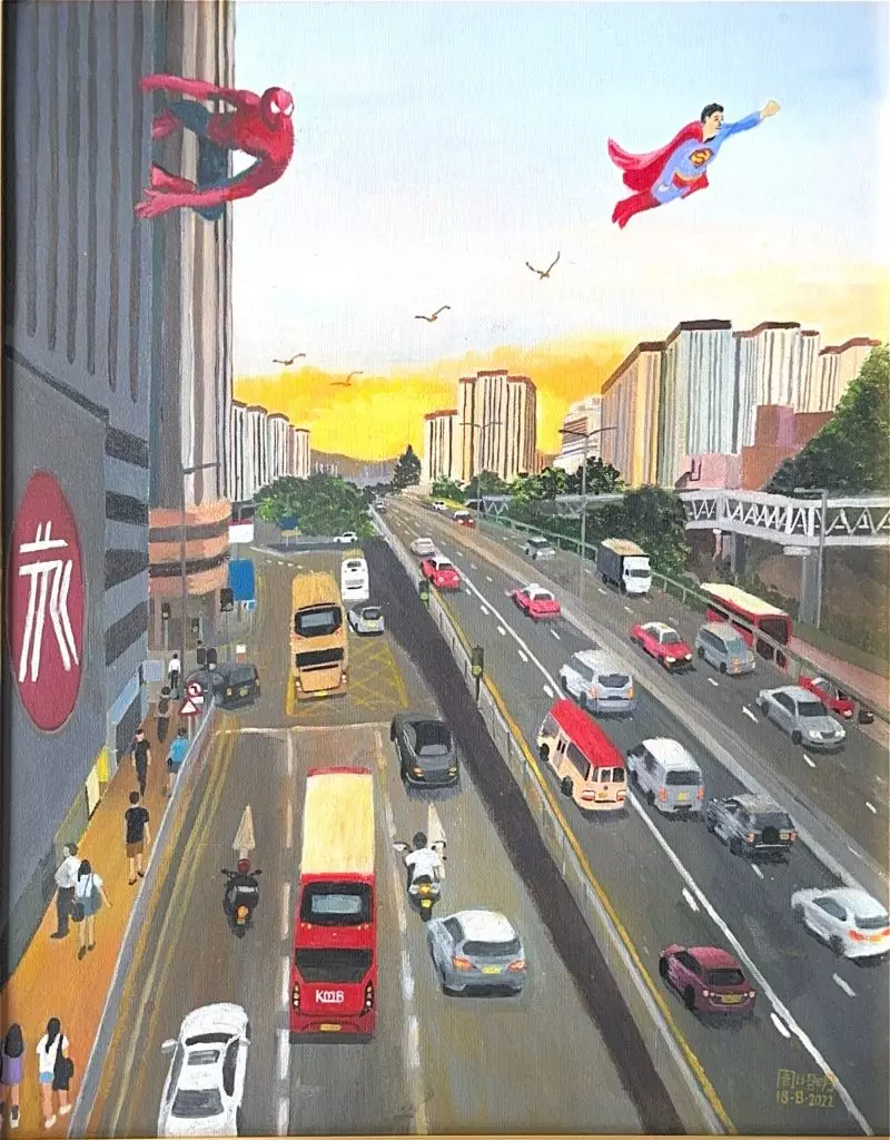 其中一位令人印象深刻的參展者,周昭明,畢業於匡智張玉瓊晨輝學校。他的作品「Super Hero駕臨美孚」完美捕捉了現實與幻想交錯的美好瞬間,展現了他對藝術的熱愛和自信;另一位學員周家正則來自匡智地區支援中心(新界北),他的作品「紅色戰爭」用紅色水彩表達了他對戰爭及世界大事的深刻思考。
