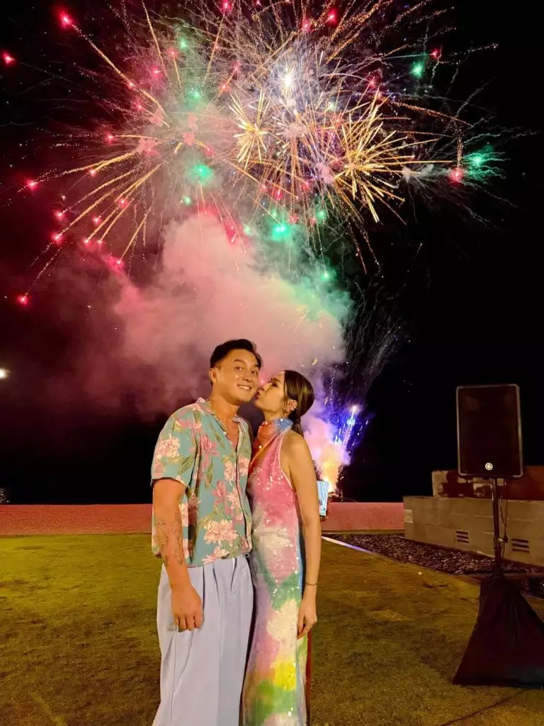 莊思明與楊明拍拖近十年,愛得高調。平安夜當晚,莊思明在社交平台分享與男友的甜蜜合照,二人在璀璨煙花背景下以同色系情侶裝示人。莊思明身穿露背長裙,更轉身大晒白滑美背,並向楊明連環送吻,畫面浪漫。