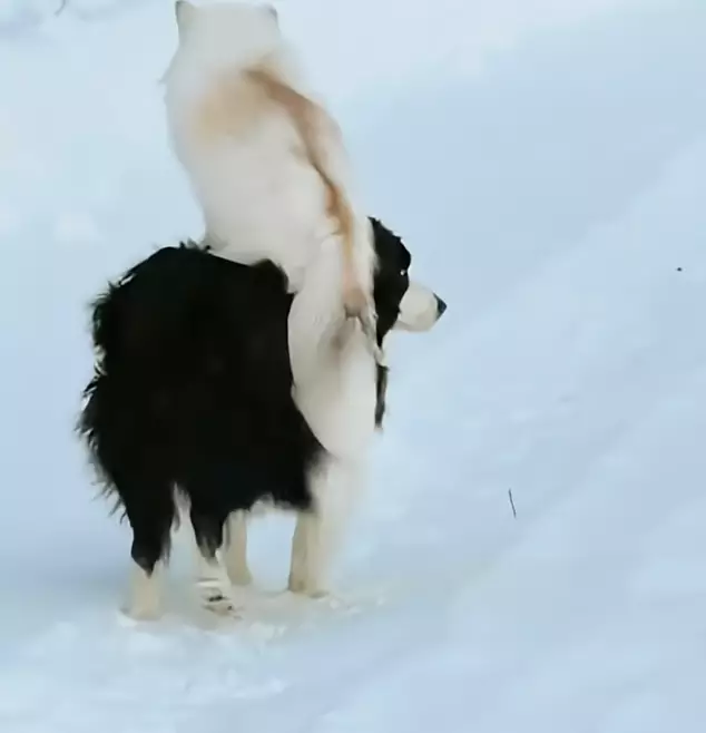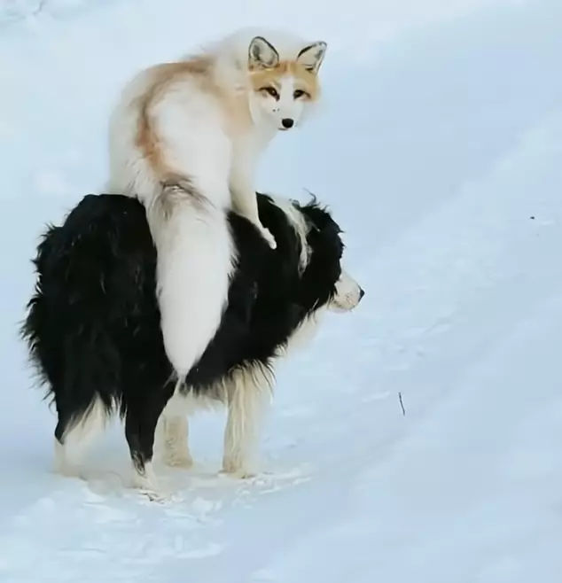 沒想到現實中真的上演了狐朋狗友!一隻白狐狸大膽跳上邊牧背上搭搭順風車。狗狗滿臉無奈卻乖乖配合,這對跨物種組合萌翻全網。
