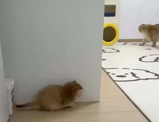 小貓藏牆角想嚇媽媽。影片截圖