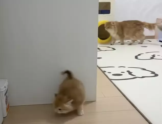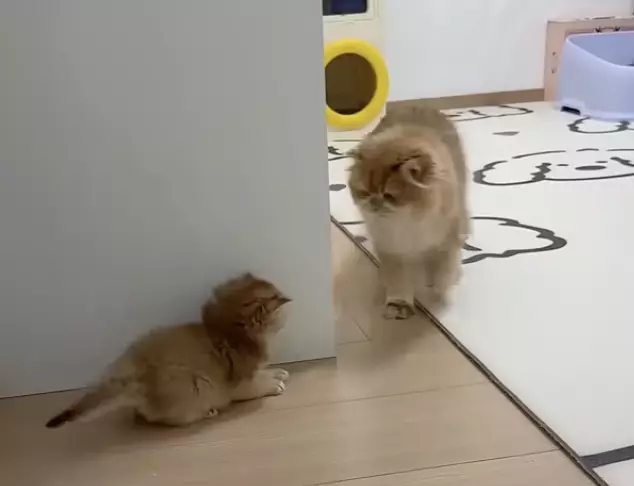 一隻橘色小奶貓打算從牆角發動突襲嚇唬貓媽媽,卻因動作笨拙過頭,再加上貓媽天生帶著的威嚴冷冽目光,讓原本雄心勃勃的小傢伙瞬間洩氣,最後乾脆變成小尾巴溫順打招呼。