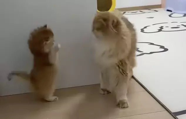 見勢頭不對,小奶貓的求生本能立刻上線,原本伸出的小爪子迅速縮回,臉上的兇狠表情也轉為低姿態的乖順,像是在尷尬地問好,接著還假裝一切沒發生地在貓媽旁邊繞圈,最後終於忍不住一溜煙逃跑離開。
