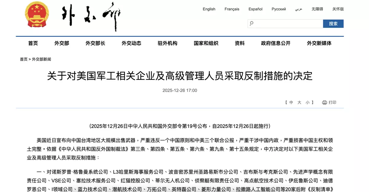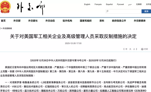中方因應美國近日宣布對台大規模售武,決定對近年參與武裝台灣的20間美國軍工相關企業及10名高級管理人員,採取反制措施,包括凍結財產和禁止入境等。
