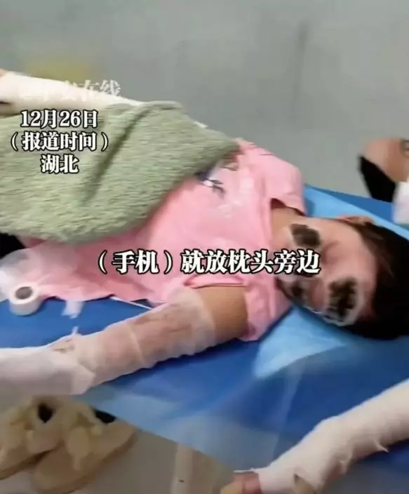 湖北女將手機放枕邊充電突自燃爆炸,導致臉部及身體遭嚴重燒燙傷留大面積疤痕。