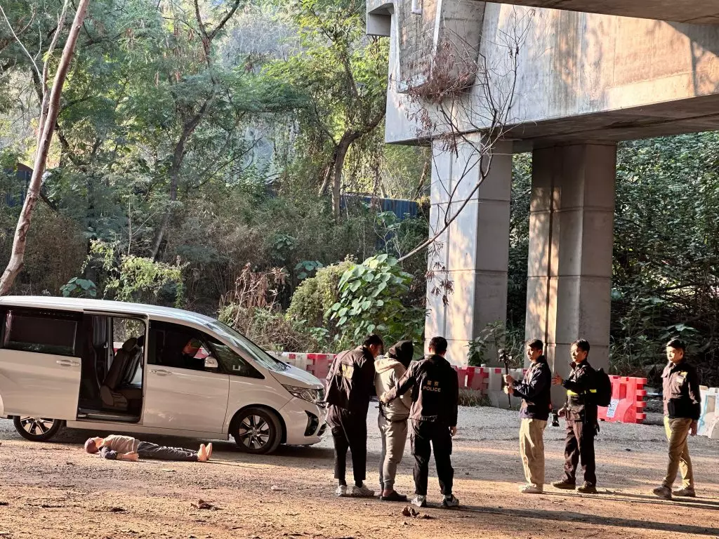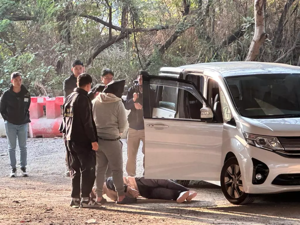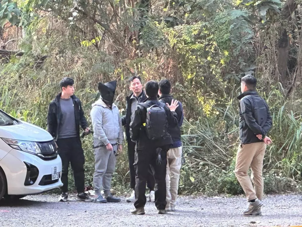 被捕男子黑布蒙頭、身穿灰色外衣和長褲,被鎖上鐵鏈、由探員押解乘坐一輛白色七人車到場,離開車廂後不時指向私家車方向,期間向探員講述情況,之後又將一個假人道具從車上拉出車外。