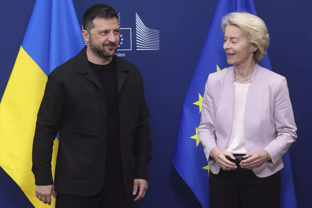 澤連斯基(左)在比利時和馮德萊恩(右)八月曾會面。AP資料圖片