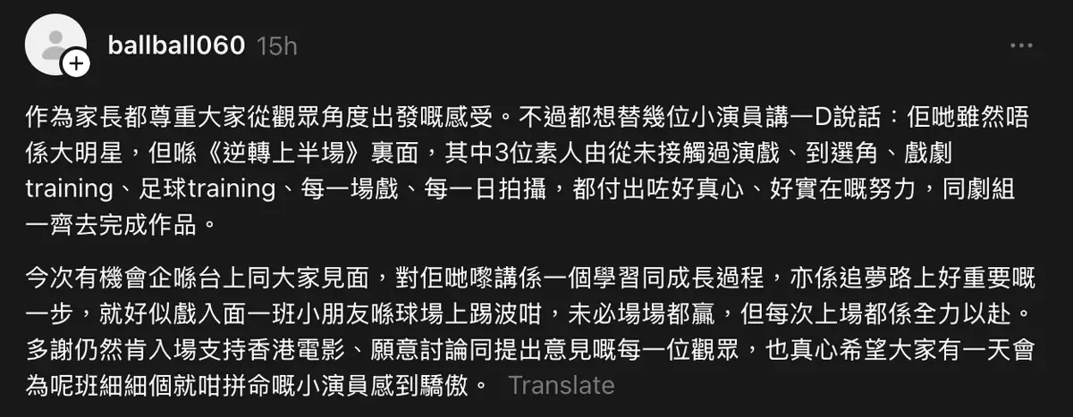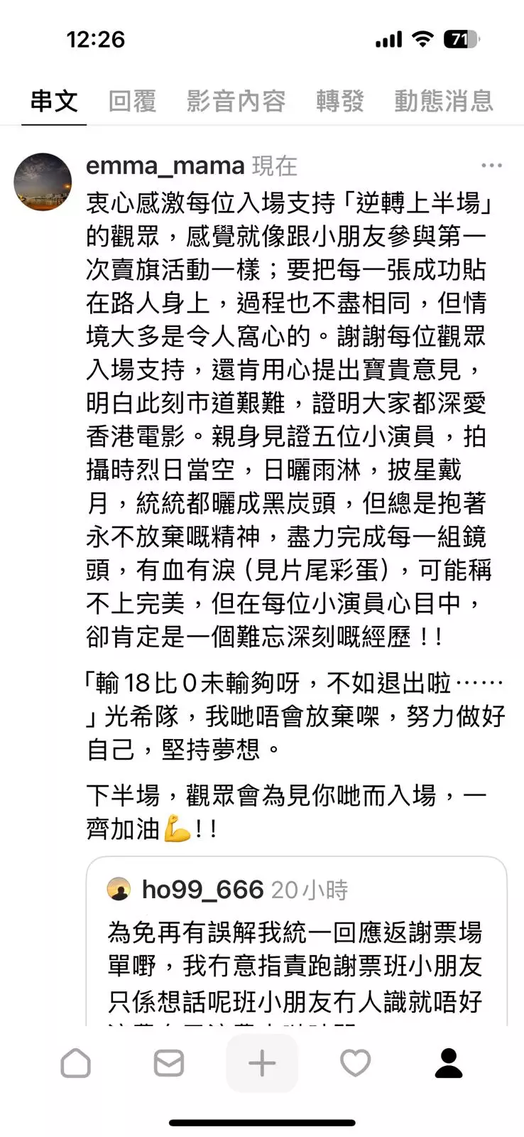 此外,《逆轉上半場》近日於部分謝票場次引起網上討論,質疑謝票場僅由片中小演員出席,未符觀眾期待。對此,《逆轉上半場》的導演黃柏基回應:「得悉小演員在閱讀相關帖文後,自責『出嚟謝票好失禮』,知道觀眾對謝票場安排有不同期望,亦尊重外界對宣傳策略的評論,但同時希望大家理解,出席謝票的小演員同樣是用心完成作品的一分子。小演員本身亦是重要角色,演員謝票並非單純工作,而是希望親身聽取觀眾觀後感,從中吸收經驗與學習,希望外界多一分體諒,避免小演員造成心理壓力。」