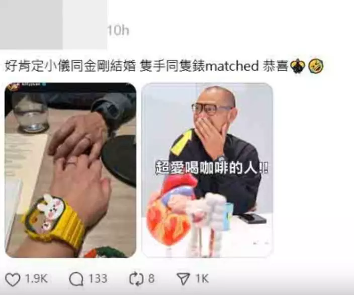 不過亦有網民反駁,指該手錶款式常見,且金剛手指形狀與照片不符;更有人翻出小儀與另一男子的飯局合照,質疑他才是真命天子。真相未明,但小儀的「神秘老公」已成為網絡熱搜,網民繼續化身偵探,希望找出更多蛛絲馬跡。