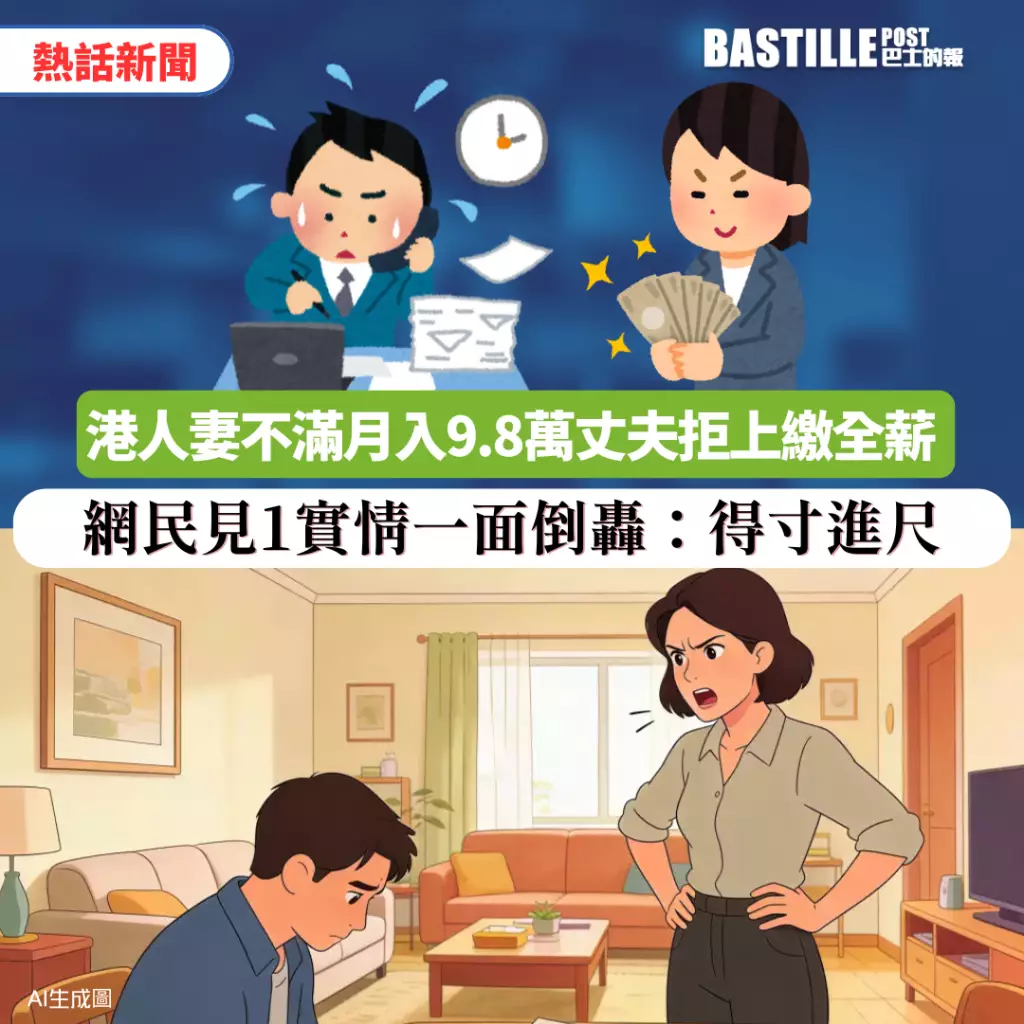 一名本港人妻近日在社交平台發文,抱怨月入9.8萬元的丈夫拒絕將全數薪金上交。帖文引發網民熱議。