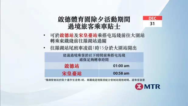 啟德體育園當晚將舉行跨年演唱會,屯馬綫會在午夜後,演唱會散場時加強服務。乘客可於啟德站及宋皇臺站乘搭屯馬綫前往大圍站,轉乘東鐵綫前往羅湖站過關。至於前往羅湖站的尾班車,凌晨1時15分會在大圍站開出。港鐵提醒參與跨年活動的乘客,留意東鐵綫過境列車的服務時間,並預早為行程作出安排。