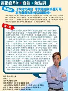 日本政府近日批准2026財年預算案,其中防衛預算約9.04萬億日圓(約合4,490億港幣),再創歷史新高。據報道,預算重點包括構建以大量無人機為核心的沿岸防衛體系「盾牌」,採購高超音速導彈和改進型12式反艦導彈等。至於早前拋出涉台嚴重錯誤言論的首相高市早苗又蠢蠢欲動,或將到靖國神社「拜鬼」。