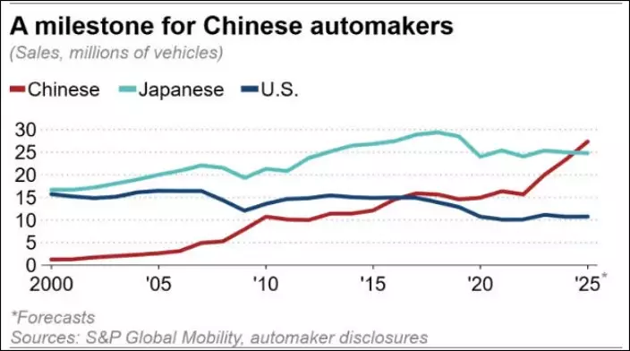 2025年新車銷售和出口量,中國車企的全球銷量將躍居首位,超越20多年來一直居首的日本。