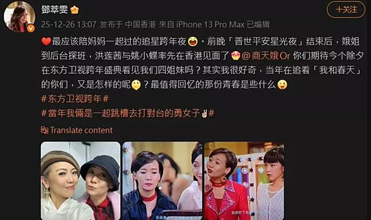 萬綺雯日前現身拍攝節目預告,狀態甚佳,氣息清新,凍齡外貌備受關注,她更對着鏡頭分享新年展望,祝願來年遇見更好的自己。至於同樣甚少露面的商天娥,則以一頭清爽短髮拍攝個人預告片,被網民大讚面色紅潤、精神狀態極佳。鄧萃雯亦在社交平台發文預告合體消息,留言問道:「你哋期待今個除夕見到我哋四姊妹嗎?」隨即獲大量粉絲按讚支持,期待這場久違的重聚。