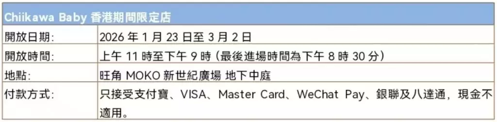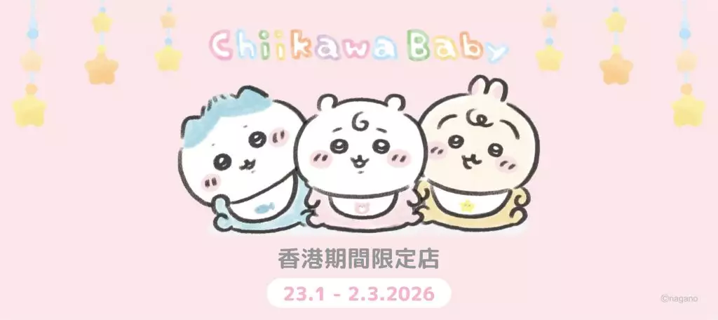 全城期待的 Chiikawa Baby 香港期間限定店終於登陸香港!由本地生活品牌 NIKO-NIKO Lifestyle Store 獨家呈獻 Chiikawa Baby 香港期間限定店,將於 2026 年 1 月 23 日至 3 月 2 日於MOKO 新世紀廣場登場!作為Chiikawa Baby 期間限定店全球巡迴的其中一站,Chiikawa Baby 香港期間限定店重現日本官方巡迴快閃店場景,讓大家能一秒置身於Chiikawa Baby 的可愛空間,除了必影打卡位外,現場更有多款日本直送官方授權商品,更驚喜的是「Chiikawa Baby」第 2 彈新品會與日本同步發售!