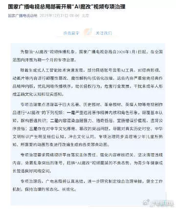 國家廣播電視總局2026年1月1日起,就生成式人工智慧AI片段傳播亂象,在全國範圍開展為期一個月的專項治理。