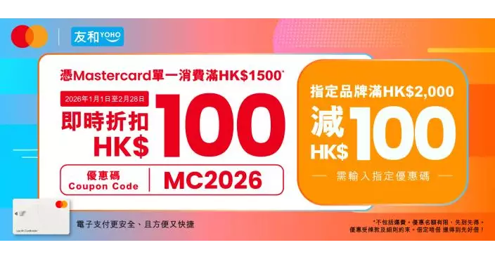 由2026 年 1 月 1 日起至 2026 年 2月28日,憑 Mastercard 於友和 YOHO 網店單一消費滿HK$1,500,輸入優惠碼「MC2026」即減 HK$100。