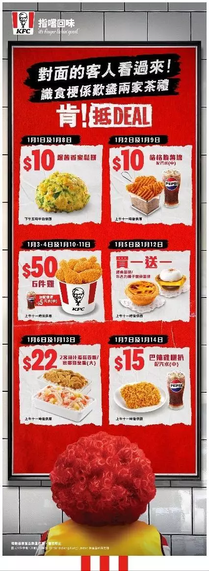 KFC「肯!抵 DEAL」於 2026 年元旦延續驚喜,以連繼兩週超抵 Deal 優惠陪你開心踏入新一年!你知、我知,全香港都知的定律——快餐界每年年頭都會推出不同優惠讓你開心過年,各家都出優惠當然要一齊歎到盡!對面的客人望過來!今次 KFC 至抵 Deal 的各款主食、小食優惠即將輪番登場,精心策劃讓你搭配出最超值的美食組合,識食的各位梗係要歎盡兩家茶禮!