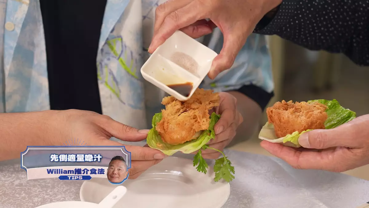 另一味推介酥炸帶子概念來自酥炸生蠔,帶子勝在一年四季都食到,配合中西合璧食法,William說︰「喺荷蘭、比利時食炸薯條係有蛋黃醬。我同呢度老闆講,唔好淨係喼汁、椒鹽,試下加蛋黃醬。加埋以前鄉下人食酥炸嘢用生菜包住嘅食法。」他還自爆有一款私房菜單酥炸香蕉,是專誠叫店家為自己炮製。他又示範正宗奄仔蟹糯米飯的食法,先整鬆糯米飯,再將蟹膏跟糯米飯拌勻,讓每一口飯蟹味更加濃郁。而奄仔蟹膏較其他蟹更加香甜,提昇糯米的飯香。