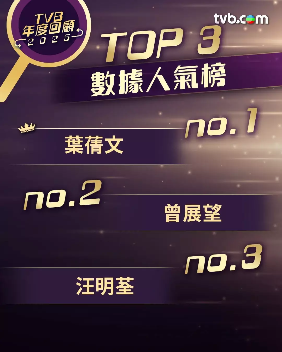 2025年,TVB 官方媒體於搜尋引擎及各大數碼平台全面發力,多項節目及藝人於年度搜尋榜強勢霸榜。雅虎香港之前揭曉了2025年「Yahoo全年搜尋人氣榜」結果,在13個熱搜排行榜中,TVB劇集綜藝在「十大熱搜本地電視劇/串流平台劇集及節目」排行榜中成功霸榜,在頭十名之中佔據了足足九個席位,上榜作品依次為第1名《女神配對計劃》、第2名《新聞女王²》、第3名《中年好聲音3》、第5名《巨塔之后》、第6名《刑偵12》、第7名《奪命提示》、第8名《執法者們》、第9名《東張西望》及第10名《金式森林》,成績斐然。至於在2025年人氣大大躍升的曾展望,則在Yahoo搜尋「十大熱搜娛樂人物」排行榜中佔據第十位,躍進表現有目共睹。