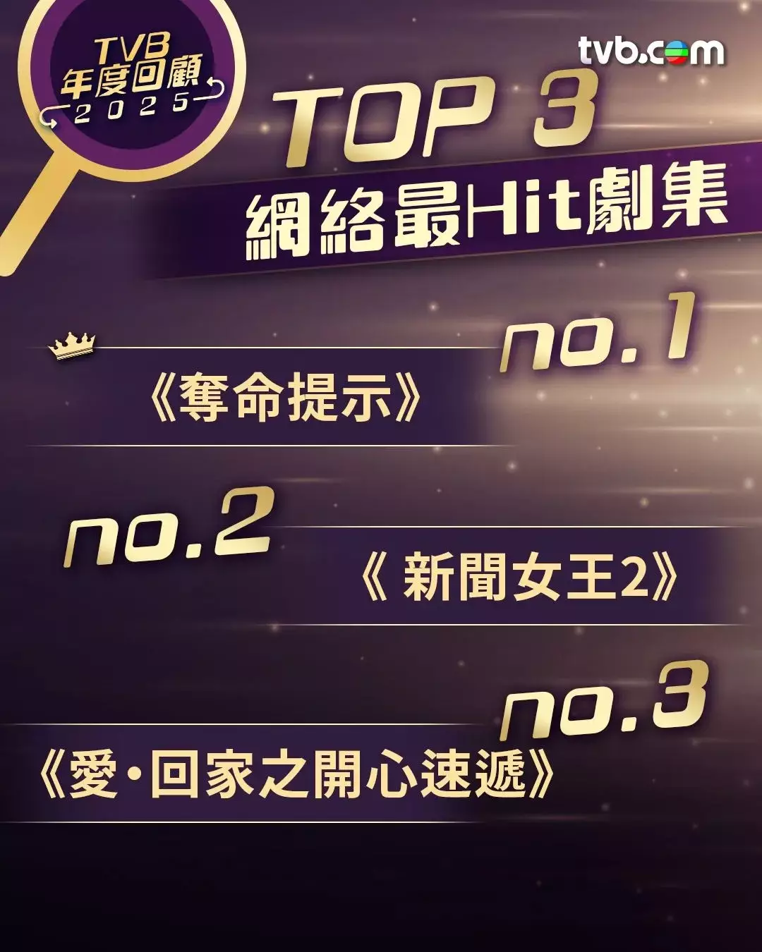 其實過去一年,TVB 在 YouTube及社交平台交出了超亮眼成績單,網絡表現屢創新高。根據TVB各大社交平台互動量所得,2025年網絡表現最好的劇集及綜藝節目,頭三甲依次為《女神配對計劃》、《奪命提示》及《新聞女王²》,互動量分別為約170萬、138萬以及122萬。若分開計算,網絡最Hit劇集頭3甲依次為《奪命提示》、《新聞女王²》及《愛.回家之開心速遞》;網絡最Hit綜藝節目頭3甲依次為《女神配對計劃》、《中年好聲音3》及《東張西望》。