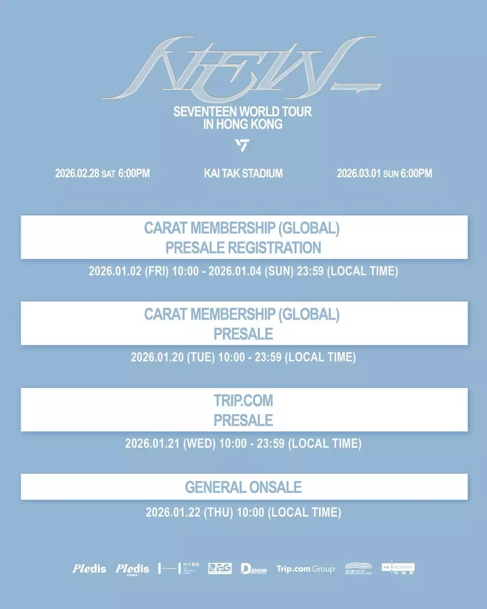 韓國超人氣組合SEVENTEEN即將於2026年2月28日及3月1日假啟德主場館舉行演唱會 — SEVENTEEN WORLD TOUR [NEW_] IN HONG KONG,這將是他們繼上年9月來港舉行演唱會後,再次在啟德主場館開唱。