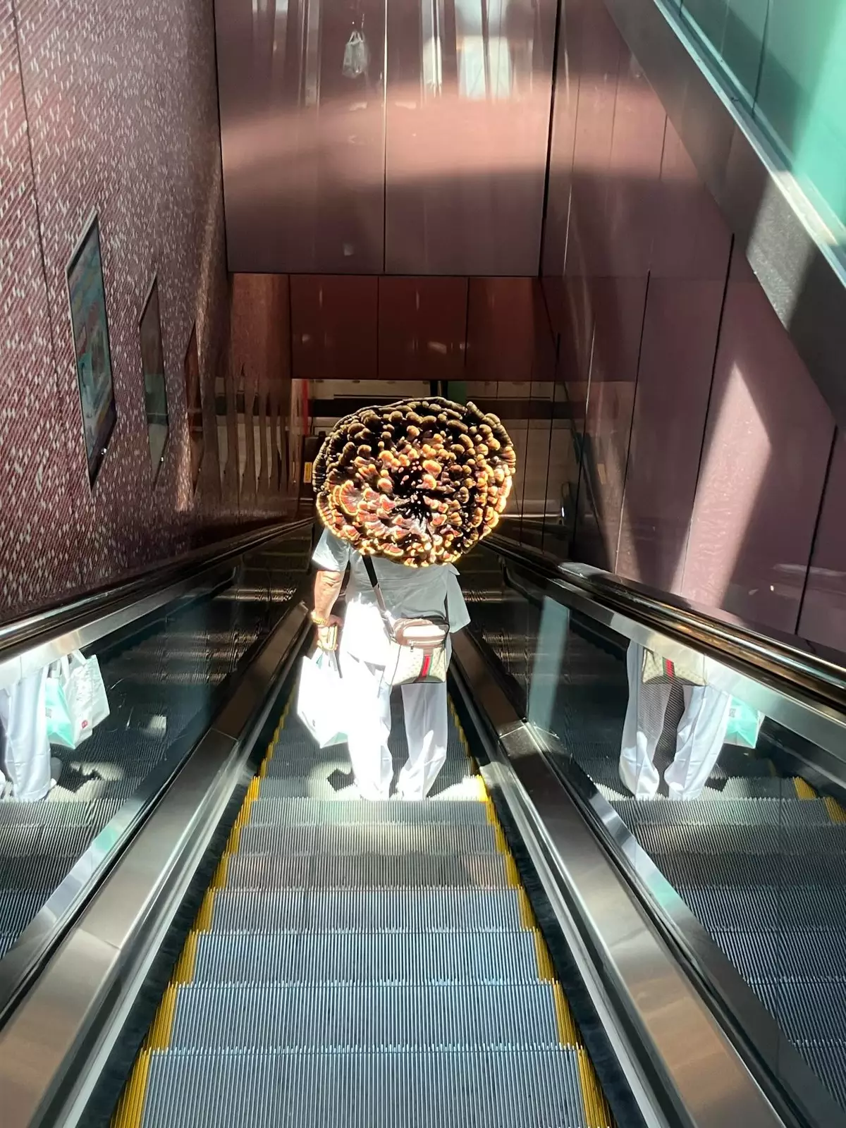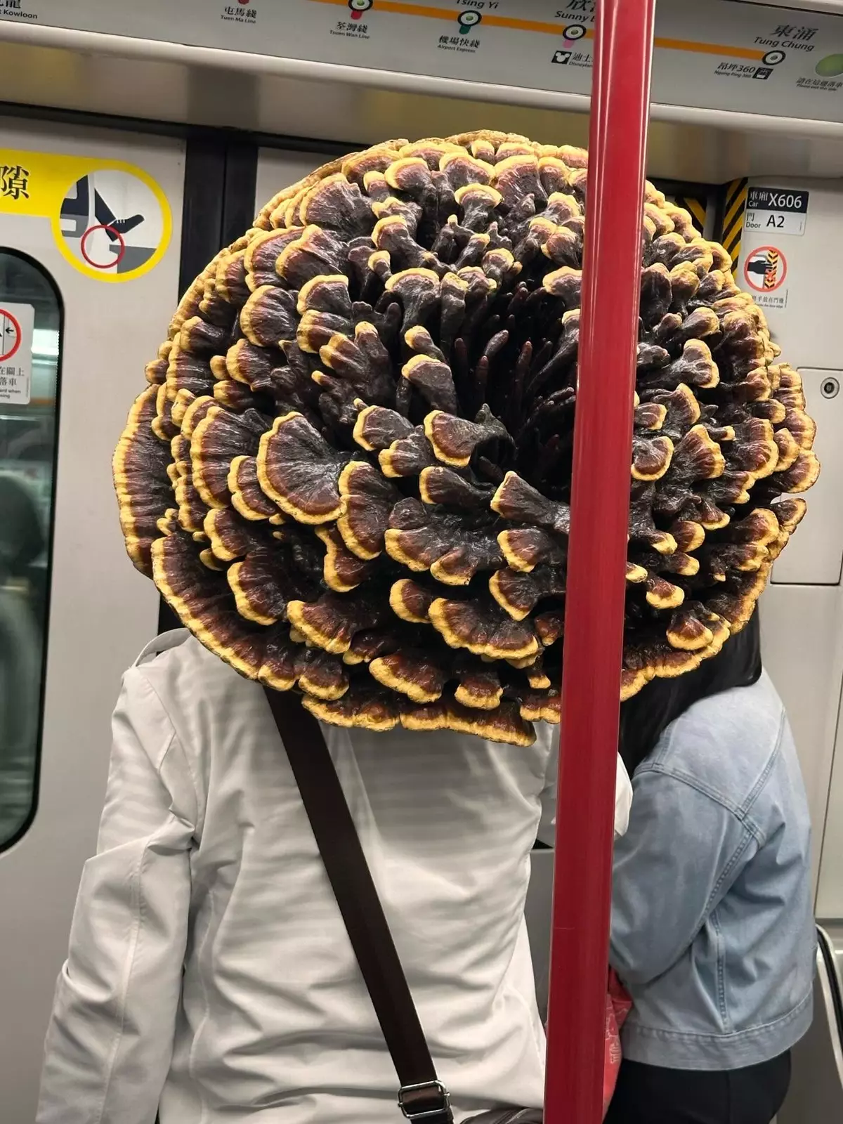 有網民在Threads以「千年靈芝」為題撰文,相中可見,一舊顏色深沉、體積龐大的菇狀物體擺放於港鐵車廂座位角落,而物主是一位斜孭袋大叔。事主感歎「香港地鐵無奇不有」,並好奇問「到底係咪真係靈芝?」。而列車到站,大叔就好淡定將件巨型物體「上膊」托住,畫面相當超現實。而相片在網上瘋傳,不少網民留言,原來都曾經「野生捕獲」過這位「靈芝大叔」。