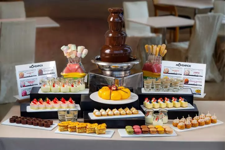 精選推介有凍海鮮盤的新鮮即開生蠔、蟹腳、凍蝦、青口、精選刺身及壽司。多款滋味熱葷將輪流供應,如避風塘炒麵包蟹、薑蔥炒麵包蟹、椒鹽鮑魚、磯燒鮑魚、燒有骨牛肉、片皮鴨、焗酥皮三文魚、燒羊脾及天婦羅等。食客更可於現場即煮區按個人喜好選擇不同麵條及食材配搭,品嚐一碗熱騰騰的叻沙湯麵。最後,還有超過15款中西式甜品和12款口味的 Mövenpick 雪糕可供品嚐。每位賓客亦可免費無限暢飲生啤、汽水、咖啡及茶,保證捧腹而回。
