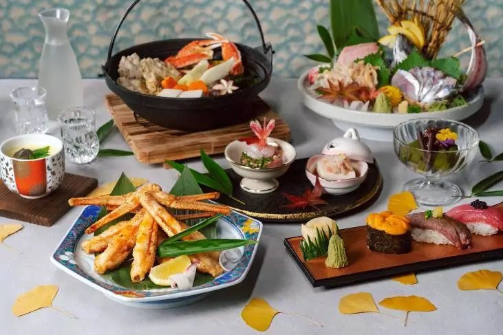 日本香箱蟹套餐帶你體驗傳統日本風味的美食之旅。開篇以燒白子作為前菜,接著品味包括拖羅、白象拔蚌及秋刀魚刺身。日本香箱蟹搭配燒喜知次一夜干,滋味無窮。隨後是海膽、赤蝦和粒貝壽司及文蛤麵豉湯。最後,為你獻上海鹽雪糕配鴨肝粉。餐點配有180毫升清酒,讓你提升整體用餐體驗。現於酒店網上商店訂購即享有9折優惠。
