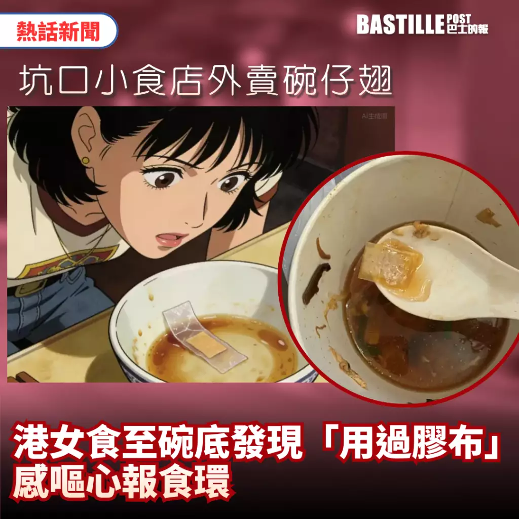 有港女在社交平台投訴,指在將軍澳坑口一間小食店外賣生菜魚肉碗仔翅,食到碗底時竟發現一塊用過的透明膠布,大感嘔心。