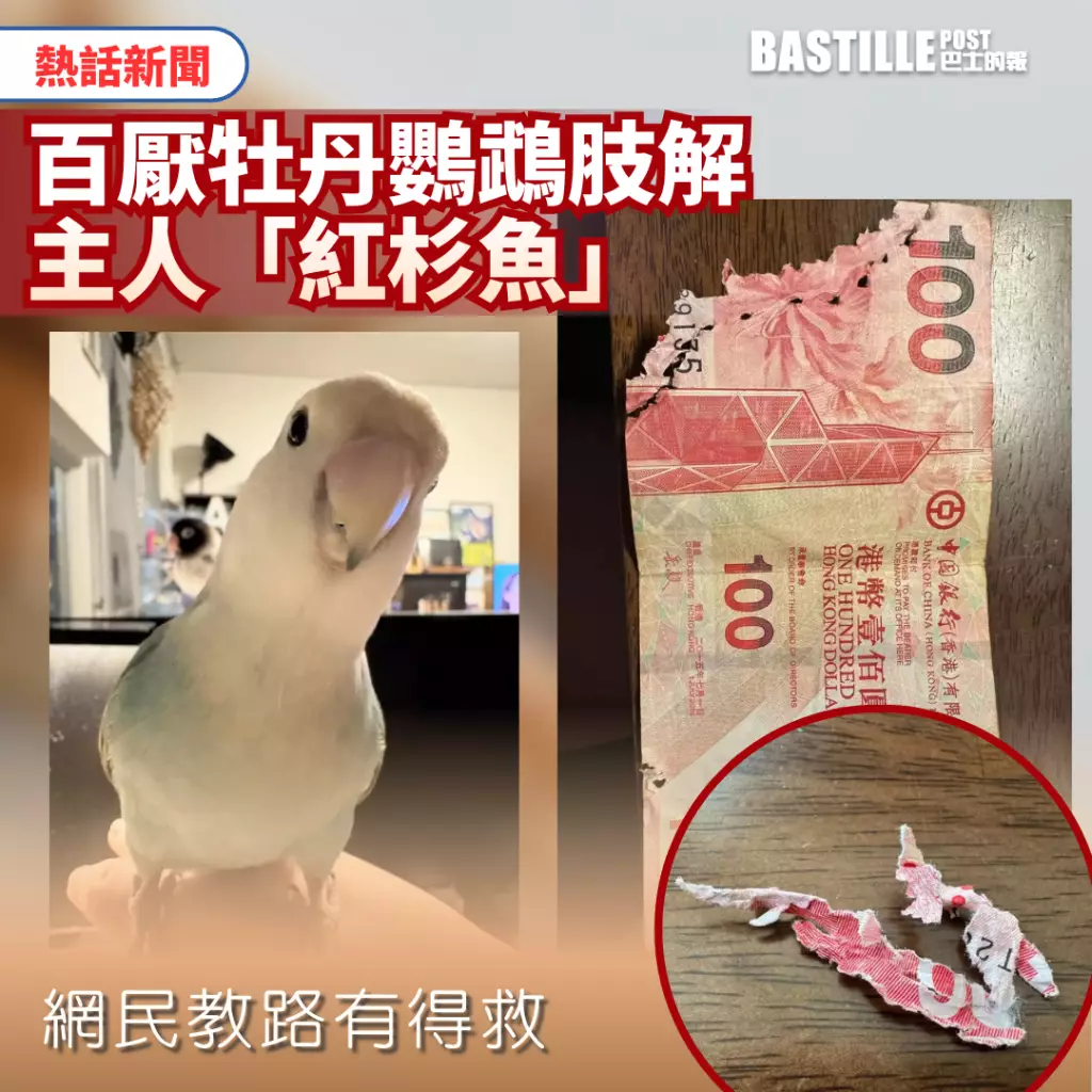 鸚鵡除了會學舌,還非常的頑皮。近日一隻百厭的牡丹鸚鵡就將主人一張百元港幣「紅杉魚」徹底「肢解」,破爛部分的還切口整齊,好似縫紉機留下的痕跡。慘遭破財的主人不得不到網上求助,幸得網民指點,告知損毀鈔票仍有得救。