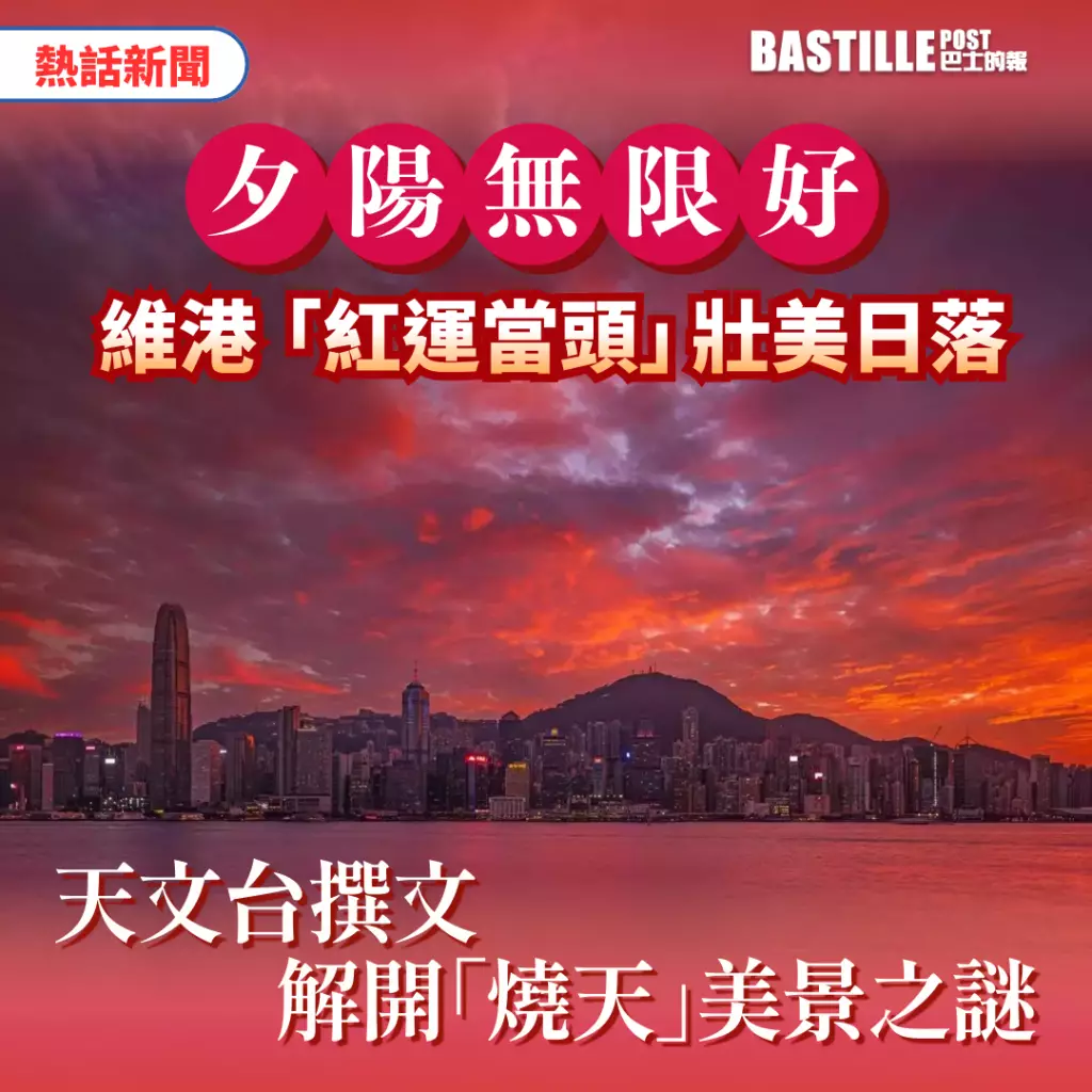 夕陽無限好!日前本港天空上演了一場絢爛的日落盛宴,滿天紅霞「燒」遍天際,將維港染成酒紅色,壯麗的景色令人驚歎大自然的神奇。