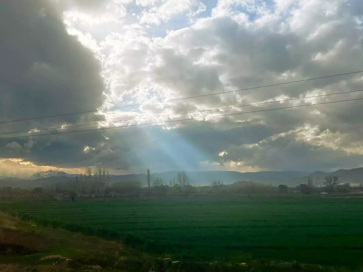 伊朗拉齊(Razi)11號公路旁,土耳其邊境口岸附近,陽光穿透雲層灑在田野上。2026年4月9日周四。(美聯社圖片/Francisco Seco) AP圖片