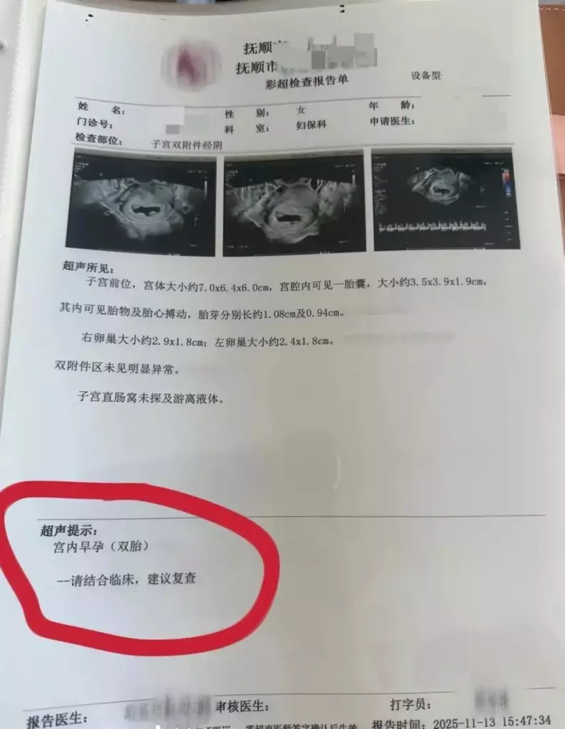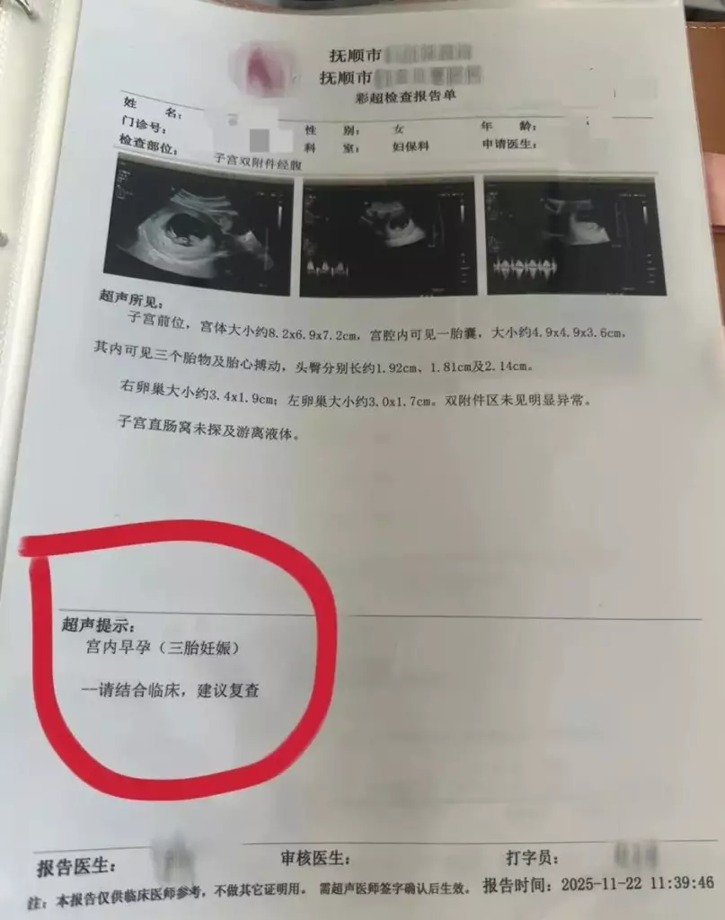 遼寧撫順一名30歲王女士近日在社交平台發文,稱自己懷孕後經歷四次產檢,每次檢查均發現多一胎。