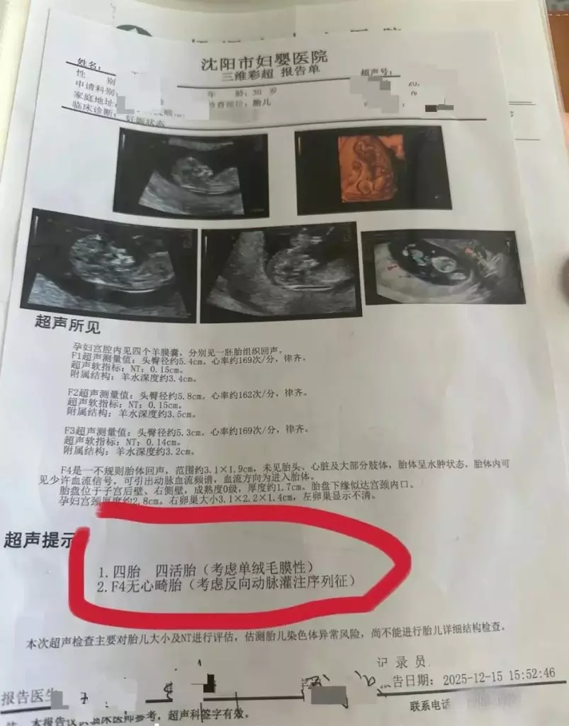 去年11月她在撫順市婦幼保健院三次檢查,結果從單胎陸續增至三胎;12月到瀋陽市婦嬰醫院復檢,竟確診為同卵四胞胎,其中第四胎為無心畸胎。醫生指出,同卵四胞胎概率僅約1300萬至1500萬分之一,極為罕見。