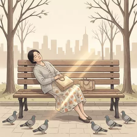 社區中心外的長椅上,一位婦人閉目小憩。手提袋擱在膝上,袋口微敞,露出半截青瓜與一包紙巾。冬陽斜照,光沿著她灰白的髮邊滑落,在裙擺上劃出一道淺金的界線。時間彷彿在此處輕輕折疊,將她與周遭的喧囂隔開一寸。