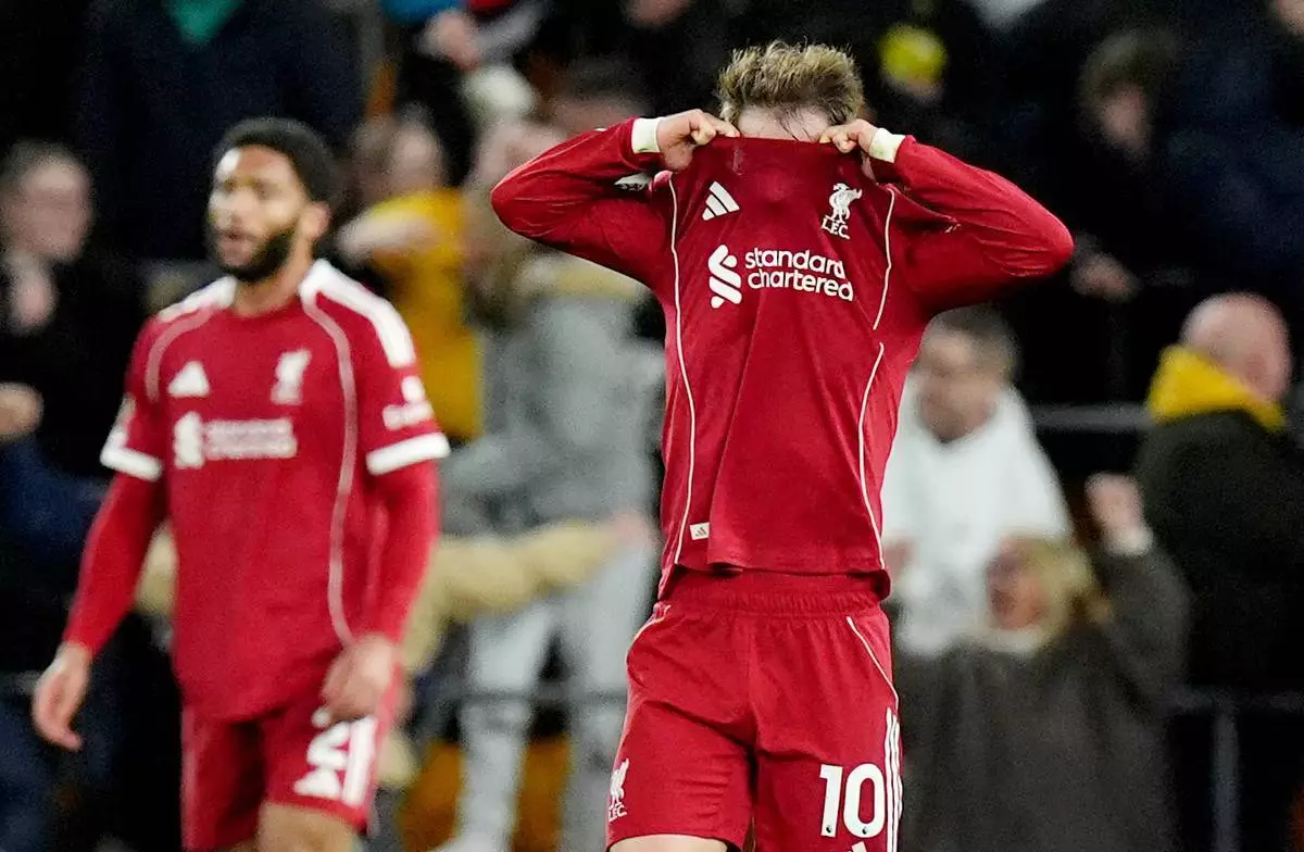 利物浦球員阿歷斯麥亞里士打(Alexis Mac Allister)在英超對狼隊的比賽中,球隊失掉第二個入球後作出反應。攝於2026年3月3日,英格蘭伍爾弗漢普頓。(美聯社圖片/Jacob King/PA) AP圖片