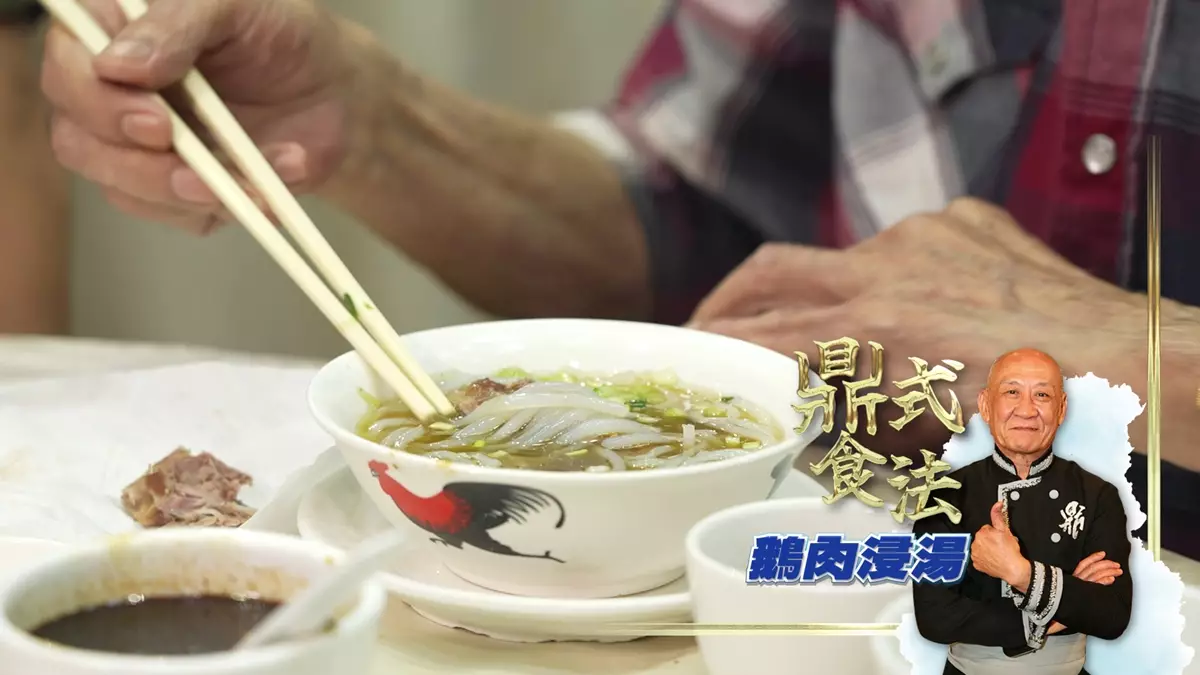 鼎爺指導行仔燒鵝瀨粉的最佳食法。