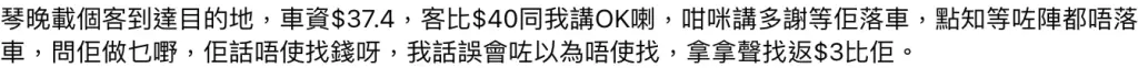 該司機在FB表示,「客比$40同我講OK喇」,所以他道謝等乘客落車,「點知等咗陣都唔落車」,司機才開口問乘客客「做乜嘢」,豈料客人劈頭就問「唔使找錢呀」,司機才驚覺自己誤會了,並「拿拿聲找返$3比佢(乘客)」。