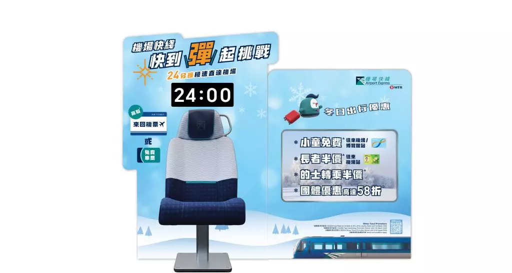 機場快綫喺呢個冬季 (⾄ 2026 年 3 ⽉ 1 ⽇) 爲⼤家送上⼀系列 「冬⽇出⾏優惠」,⽅便⼀家⼤⼩親⼦旅⾏,盡享機場快綫搭乘優惠往/返機場。除此之外,機場快綫更史無前例推出「快到彈起」網上及限定街頭挑戰,成功於挑戰中顯⽰「24:00」時撳掣「彈」起,即有機會捧⾛豐富獎品,千萬不可錯過。