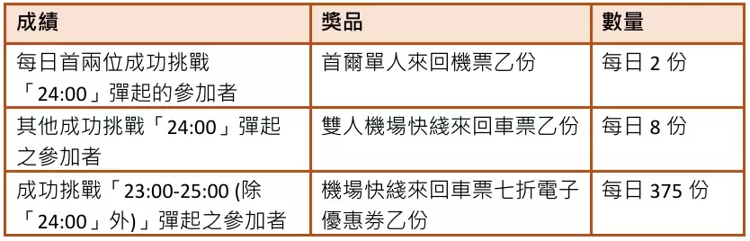 參加者只需坐上 1:1實物比例的機場快綫⾞廂舒適座椅,座椅前後設有計時器。當計時器顯⽰「24:00」時成功「彈」起,即有機會贏取: