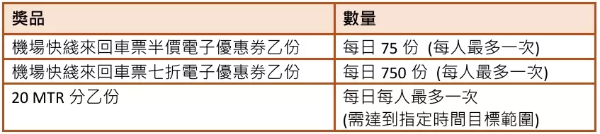 網上挑戰簡單易玩,帶你體驗「⼿」屈⼀指的24分鐘機場快綫極速之旅。只需進入⼿機版活動網⾴ (https://www.thespeedybounce.com.hk) 登入 GoogleAccount,參加挑戰並成功按中「24:00」的顯⽰時間,令機鐵仔彈起,即可贏取機場快綫來回⾞票半價電⼦優惠券! 如果於「23:00–25:00」之間令機鐵仔彈起,則可獲得機場快綫來回⾞票七折電⼦優惠券。 每⽇達成「23:00-25:00」,包括「24:00」,即可同時贏取每⽇獎品20 MTR分。