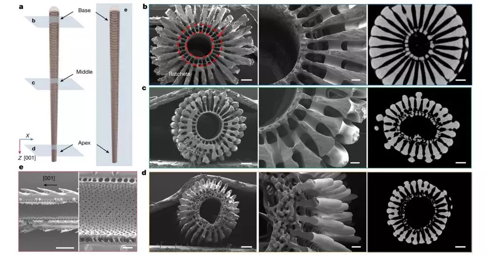 海膽棘刺的機電感知能力源自其內部獨特的雙連續梯度多孔立體網狀骨架:由大小不一的孔洞組成,並沿棘刺的基部到尖端逐漸變化,基部孔洞較大、固體密度較低,尖端孔洞較小、固體密度較高。