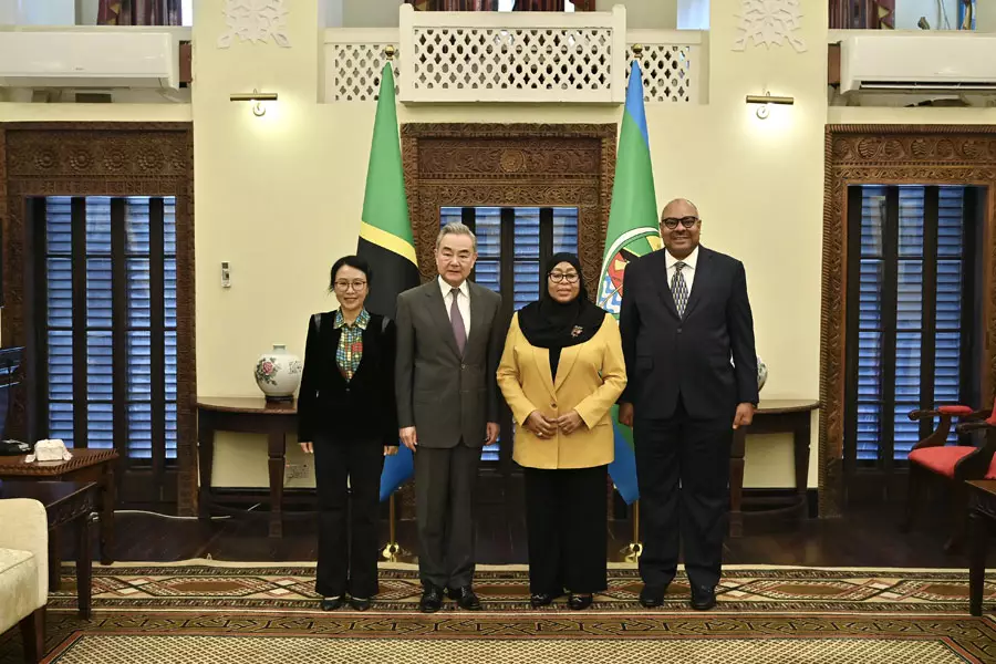 1月10日,坦桑尼亞總統哈桑(右二)在達累斯薩拉姆會見中共中央政治局委員、外交部長王毅(左二)。外交部網站圖片