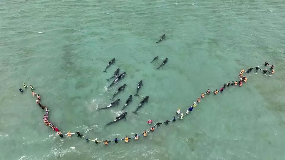 新西蘭發生領航鯨集體擱淺事件,義工嘗試協助鯨魚浮起。Project Jonah New Zealand FB圖片